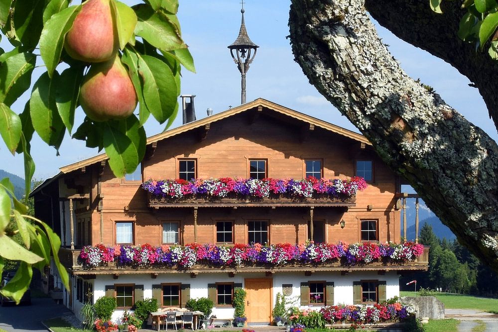 Traditional Tyrolean farmhouse with lush vegetation on the balconies and fruit trees all around.