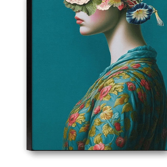 She is depicted on a turquoise background and has a field bouquet as her hairstyle.