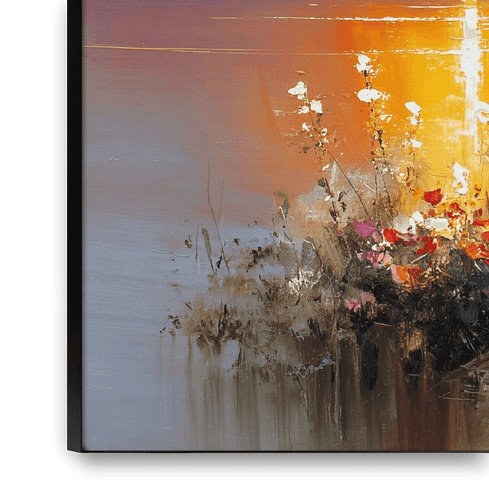 Bring the atmosphere of a Mediterranean summer evening into your home with this romantic painting: flowers in full bloom adorn the shore of a clear lake, while the sunset casts a warm glow over the…