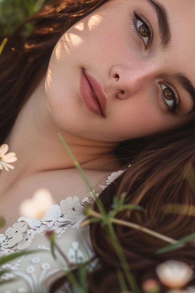 The picture shows a young woman lying relaxed in a flowering meadow. Her gentle gaze and radiant eyes are mesmerising, while the natural light gently caresses her facial features. The delicate flowers around her lend the scene a picturesque, dreamlike atmosphere that captures the beauty of nature and the moment.
