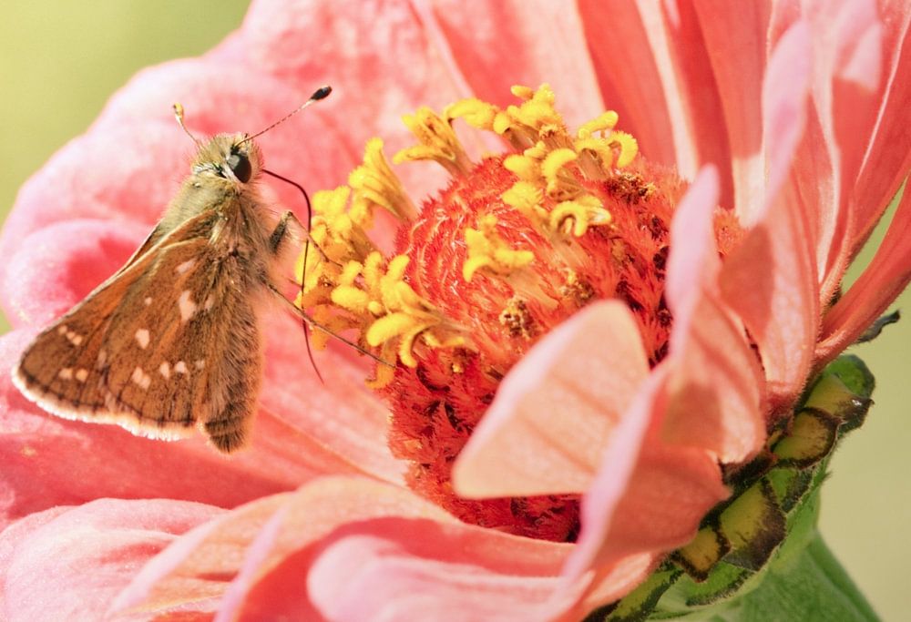 Very soft, warm photo of a tiny butterfly on a pink flower. The soft yellow background gives the photo a warm effect. I deliberately chose to give the photo low contrast to make it even warmer.