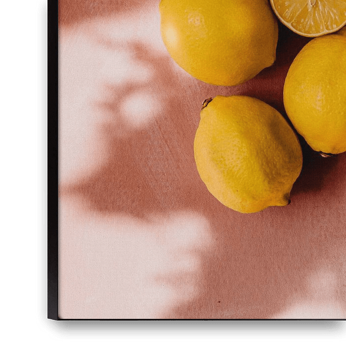 A summer picture! Yellow lemons on a pink background. With a beautiful incidence of light creating playful shadows.