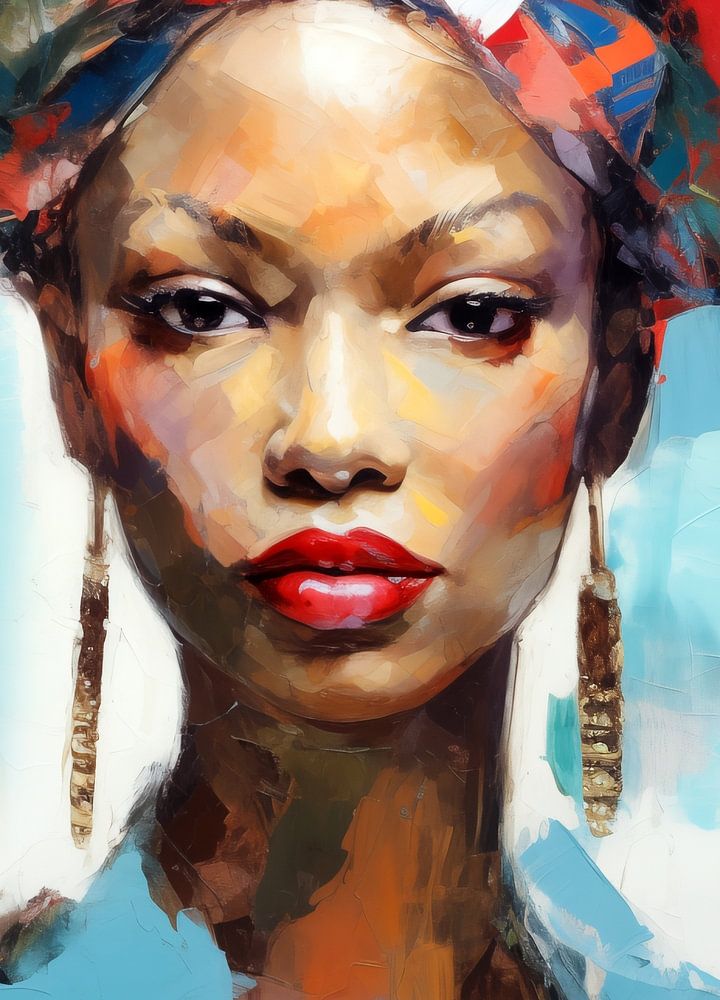 Colourful portrait of a beautiful woman in an Impasto paint style with coarse brushstrokes on canvas in mainly light blue and red tones.