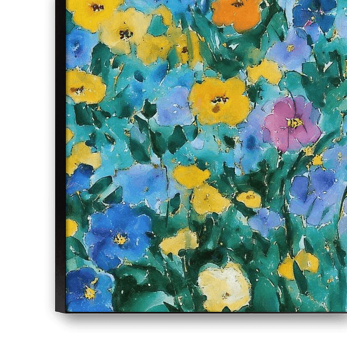 A lively field of flowers in blue, yellow, lilac and soft orange, tightly outlined and loosely set against fresh green leaves. The brush texture is playful and casual, with accents that give the scene an almost dancing dynamic. "Summer Velvet" feels like a sunny walk along a field edge in July. The bright colours bring light to a space without being overwhelming.