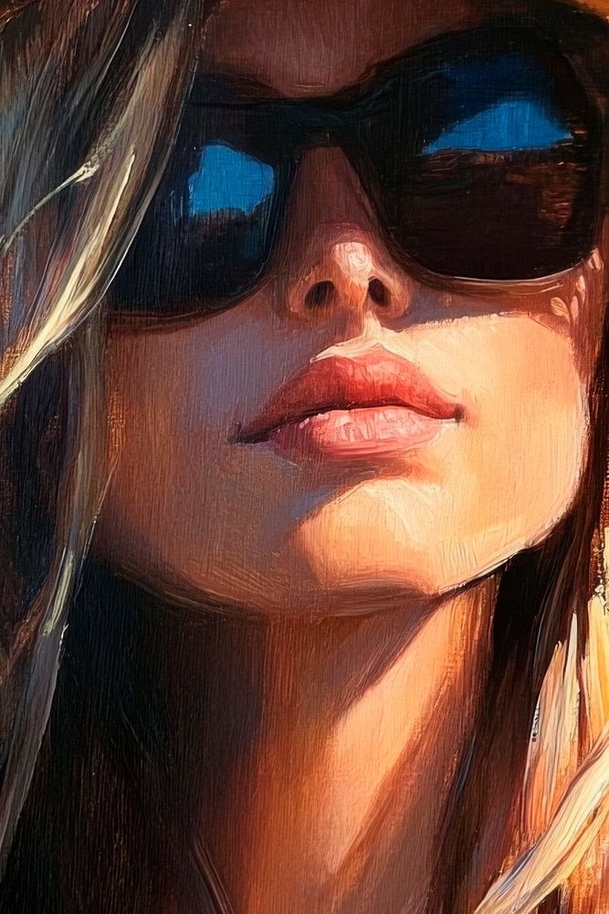 With a hint of summer dreams and light-flooded days, these majestic sunglasses radiate self-confidence. The wide-brimmed straw hat accessory frames her face, kissed by the sun's rays, and lends an enchanting flair. The soft colour nuances emphasise the interplay of light and shadow, capturing the spirit of relaxation.
