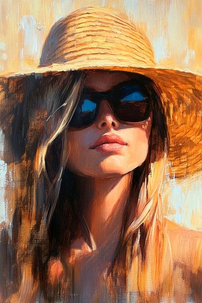 With a hint of summer dreams and light-flooded days, these majestic sunglasses radiate self-confidence. The wide-brimmed straw hat accessory frames her face, kissed by the sun's rays, and lends an enchanting flair. The soft colour nuances emphasise the interplay of light and shadow, capturing the spirit of relaxation.