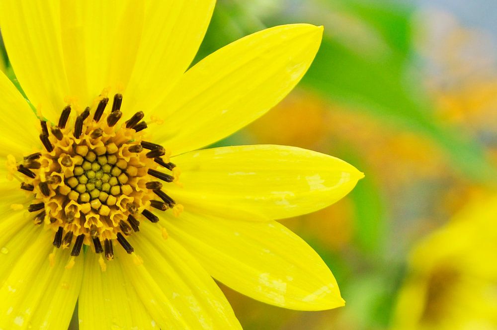 A photograph of a sort of sunflower. The bright yellow of the petals stand out against the autumn colors in the background