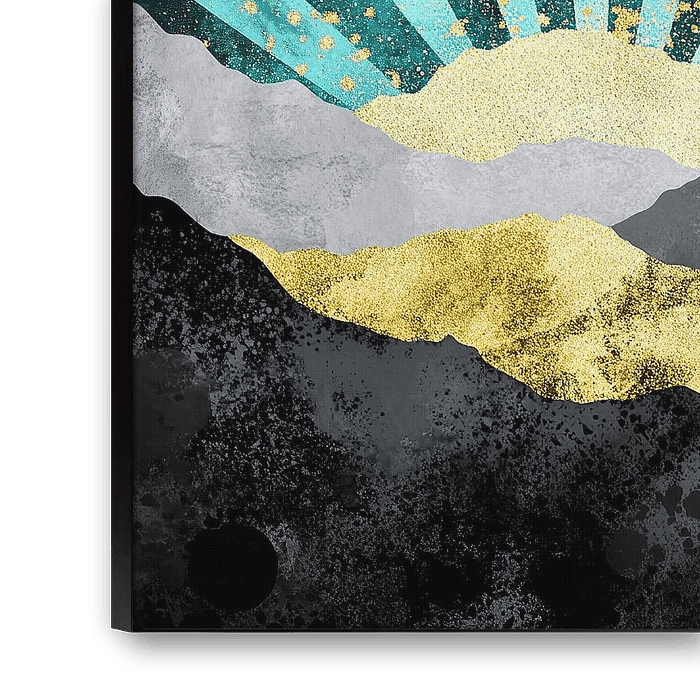 A digital illustration of sunbeams over mountains, with golden glitter and teal tones. The background is dark grey, creating a contrast between the bright colours above and the bold black below. An abstract design in gold and silver adds artistic flair. This artwork would be suitable as wall art or decoration. It could also depict a sunrise or sunset over mountainous landscapes. Vector illustration, detailed design.