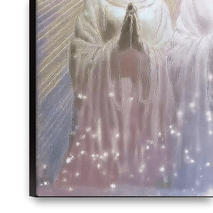 Sun Prayer. Three women with hands in prayer position. The sun is shining in the background and the sun's rays fill the canvas.