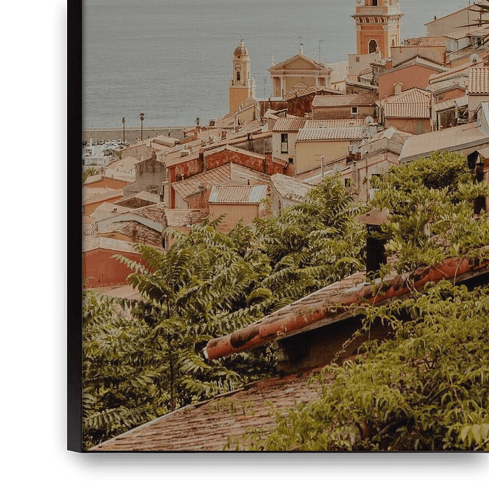 Views over the rooftops of the old centre of the French town of Menton, the Basilica Saint-Michel-Archange and in the background the Mediterranean Sea.