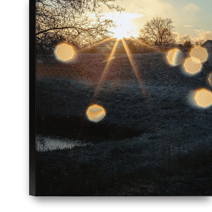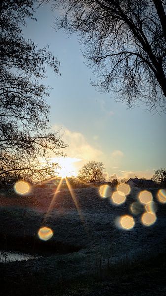 The sun breaks through after a snow shower earlier in the day. A thin snow cover lies on the grass. But the clouds have cleared and the low sun shines over the land and bare trees. First it was grey and wet because of the snow, now the sun has broken through at the end of the day and illuminates the surroundings, and all that remains…