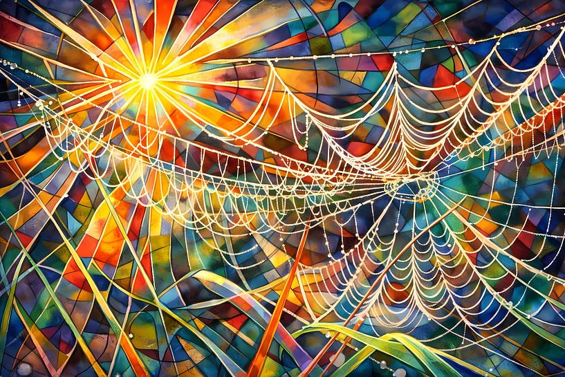 A vivid display of sunlit spider webs against a multicoloured background. The use of light and colour creates a dynamic and energetic scene.