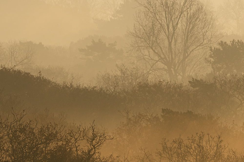 A view of the Meijendel dunes, north of The Hague. On a freezing morning in early December 2022, the first golden ray of sunlight caresses the vegetation and a light fog rolls in, creating a magical and mystical atmosphere. Nature can be magical.
