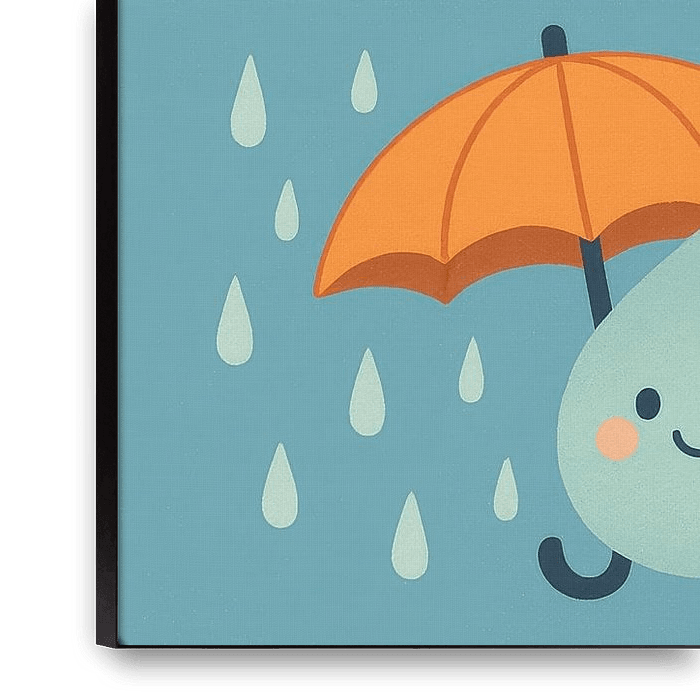 Four playful squares show a smiling sun with rays, a fluffy cloud, a raindrop under an orange umbrella and a snowflake with scarf. The background in soft pastel blue tones provides tranquillity, while warm yellow and cool blue provide fresh contrast. The round shapes, simple lines and friendly faces make the design accessible and…
