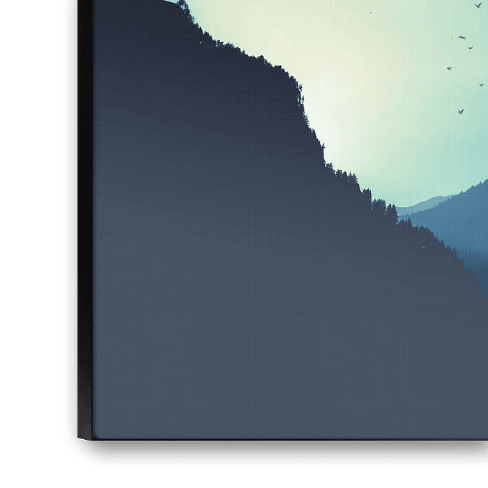 A serene sunrise unfolds behind the silhouette of the distant mountains, while a flock of birds flies gracefully through the clear sky. The calm blue colour tones and soft light create a soothing atmosphere.