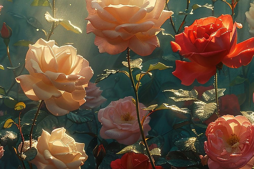 A poetic depiction of a rose garden in the sunlight with shimmering dewdrops on the leaves.