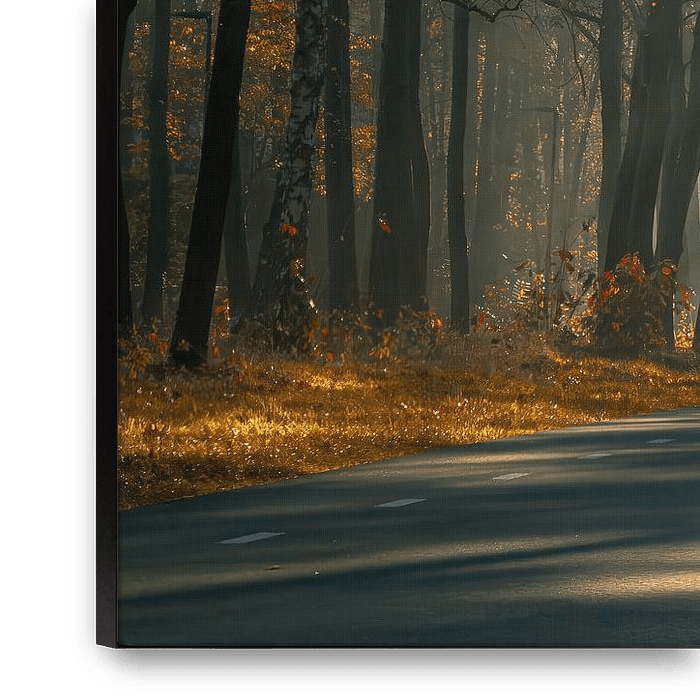 Beautiful sun harps come through the trees on a beautiful autumn morning in the Netherlands. The leaves that are already beautifully coloured stand out from the light falling on them. The empty road adds calm to the picture.