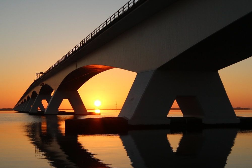 During an early summer morning, the sun rises below the Zeeland Bridge.
