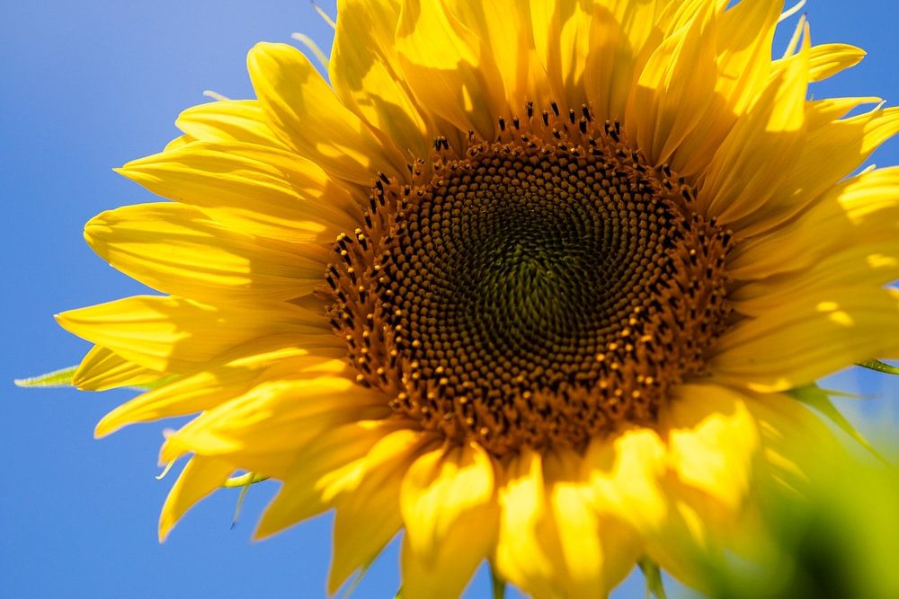In this beautiful photo, we see a sunflower in full bloom against a background of a clear, blue sky. The sunflower's vibrant yellow petals glow in the sunlight, creating a beautiful contrast with the deep blue sky. The composition of the photo, with the sunflower at the centre and in sharp focus, gives a sense of summer and freshness. This image symbolises the warmth and vibrancy of the summer months, evoking a sense of joy and positivity. It is a perfect representation of the natural beauty and simplicity often associated with summer days.