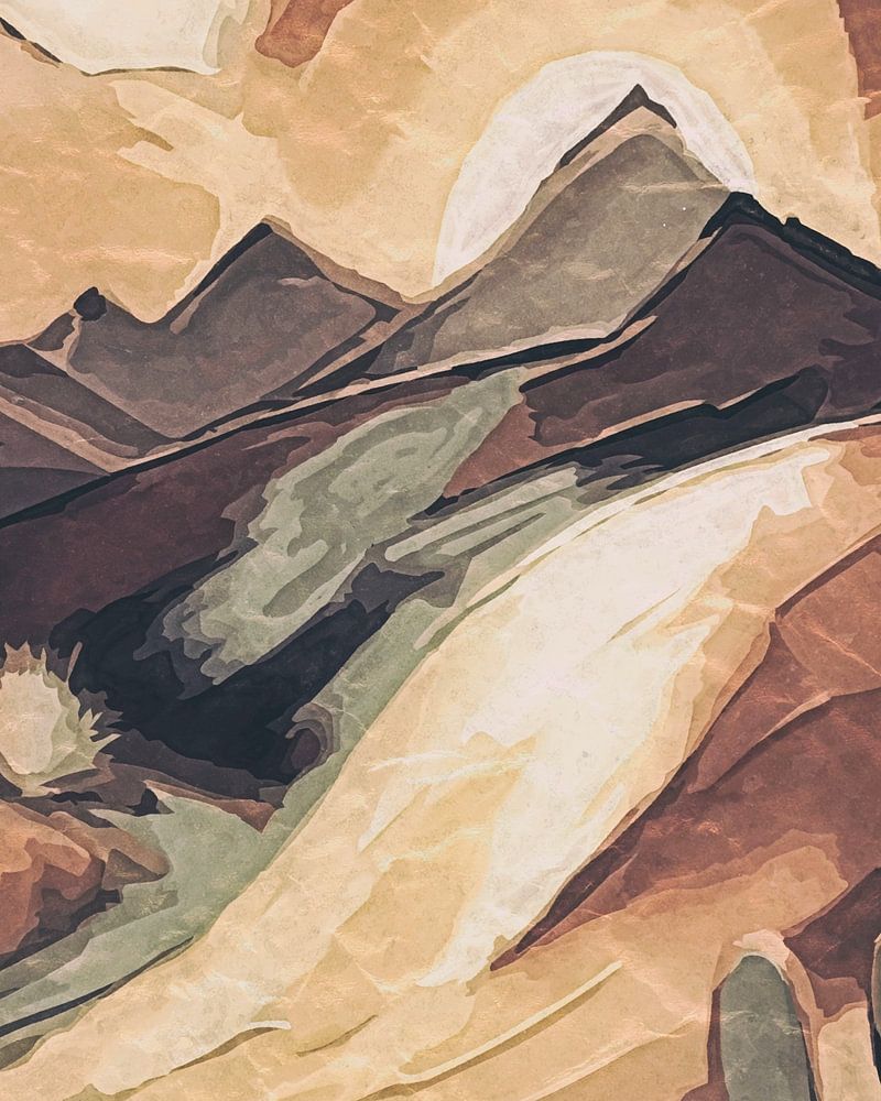 Sun, mountains and cacti in Vintage poster style is digitally created in shades of brown, terracotta, orange-yellow and grey-green. It is sunrise and the sun appears as a large sphere between two rocky mountains somewhere in Arizona. It is as if the sun and the two mountains merge into a golden whole. A few days back, it rained and some grey-green patches can be seen in some places. But in this desert-like area, rain is extremely scarce and the sun shines relentlessly. So the green patches of low-growing grasses will soon disappear again. The only plants that ground well are the desert cacti and you see them everywhere.