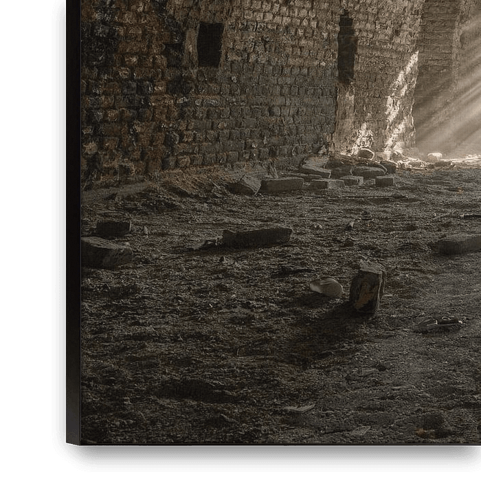 Sunbeams through the dilapidated windows in a dilapidated empty room. The rays are clearly visible because it was very dusty here.