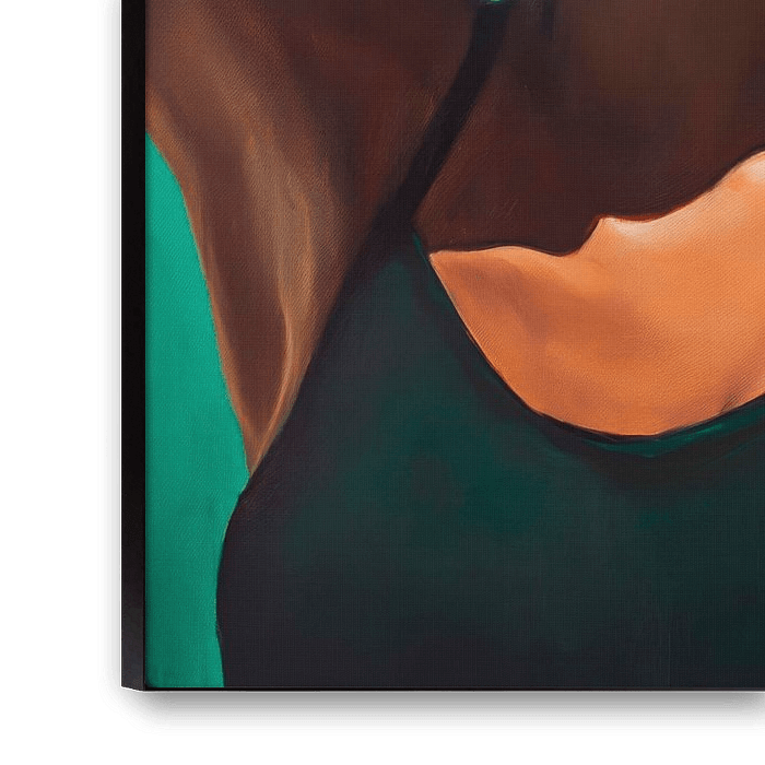 A play of light and shadow envelops the portrait of a woman whose closed eyes radiate calm and serenity. Her pose, elegant and relaxed, captures the moment, while the warm tones of her skin contrast with deep shades of green. This composition conveys a harmonious connection to nature and a sense of inner strength.