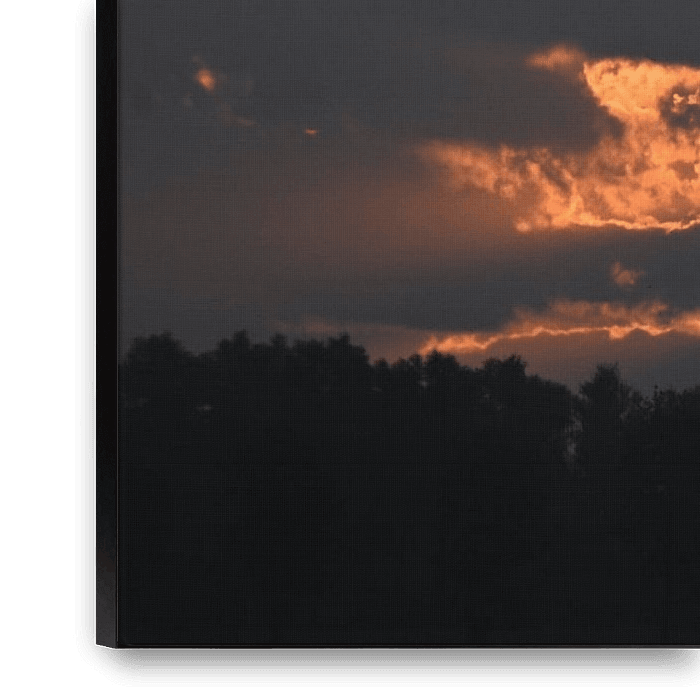 Golden rays of sunshine break through heavy clouds and illuminate the horizon above a dark tree line. A powerful, hopeful atmosphere—ideal as a statement print for your living room or office, full of depth.