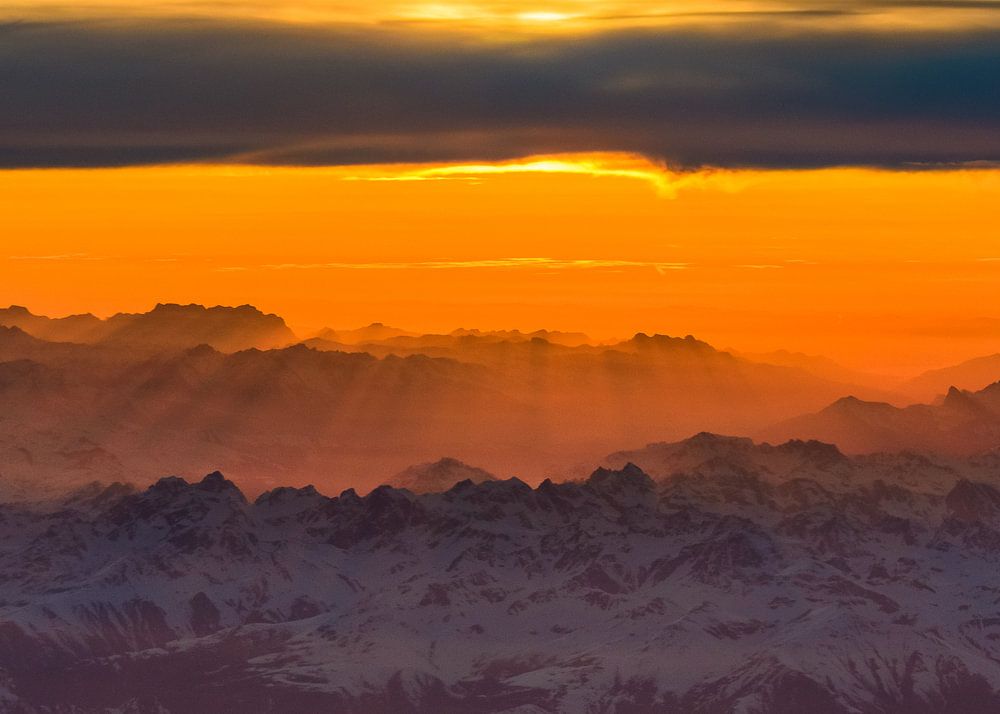 Rays of sunlight illuminate the alpine valleys, aerial photo, Austrian Alps