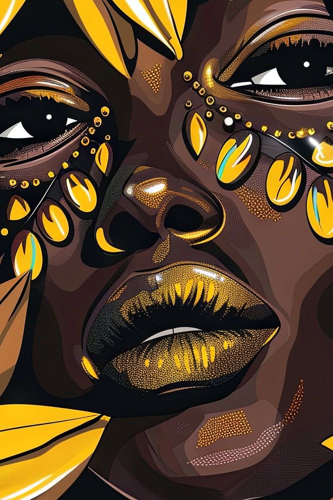 This impressive work of art shows the face of a woman framed by glowing sunflower petals. The intense yellow and gold tones contrast beautifully with her dark skin, while the ornate details and majestic presence of the woman create a captivating aura. This depiction combines natural beauty with artistic expression and is ideal for lovers of modern, colourful art. Perfect for adding a vibrant and inspiring touch to any room.