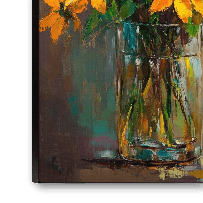 Bright sunflowers dance merrily in the glass, their radiant yellow petals catching the light and radiating joie de vivre. With strong, dark hearts and delicate green leaves, they invite you to savour the beauty of the moment. The background in soft earthy tones enhances the vibrant presence of these flowers, which act like little suns in a room.
