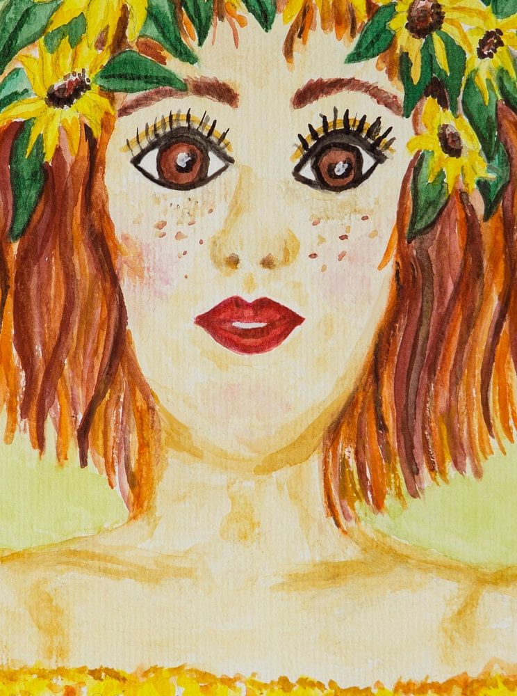 Portrait in watercolour of a young, red-haired woman with brown eyes and freckles. The yellow and orange shades of colour make it a cheerful painting. The sunflowers in the woman's hair give it a summery feel. A cheerful painting for on the wall. Also suitable for a children's or teenager's room.