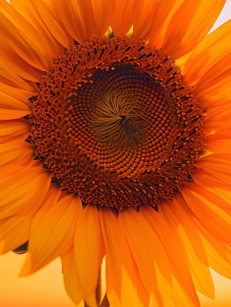 This sunflower stands proudly in the warm light of a golden sunset - its bright yellow petals catch the last rays of the day and seem to literally glow. The focus is on the perfect symmetry and fascinating details of the flower centre, while other sunflowers are bathed in soft light in the background.