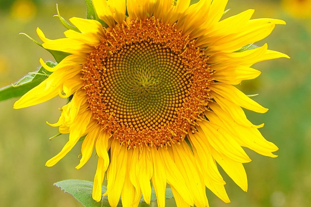 Sunflower shown individually on a field of sunflowers. Round yellow flower. Summer flower