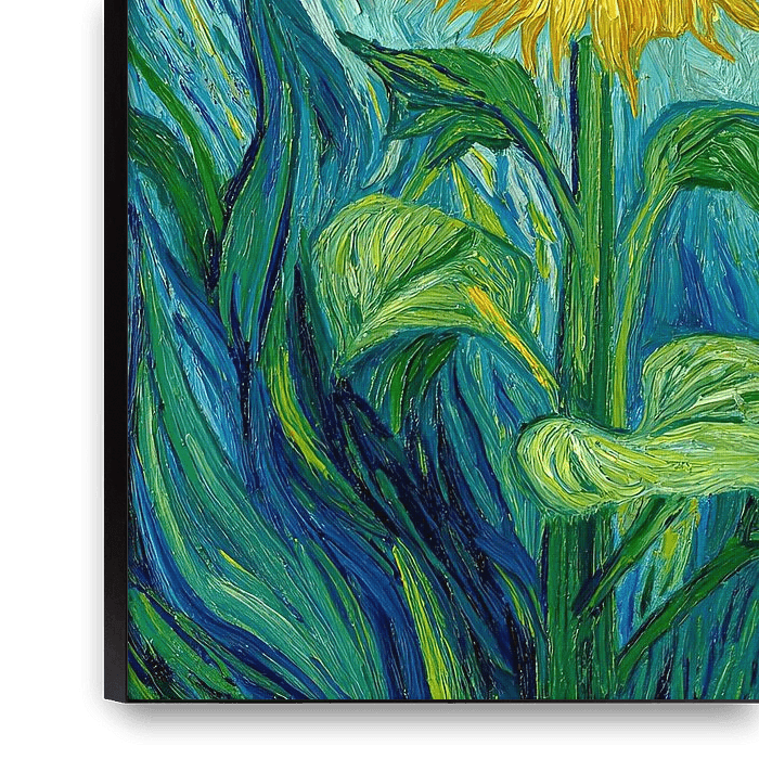 Dieses lebendige Artwork zeigt eine strahlende Sonnenblume in expressiver Impasto-Maltechnik von Vincent van Gogh, bei der dicke, pastos aufgetragene Farbschichten dem Bild eine beeindruckende dreidimensionale Struktur verleihen. Die leuchtend gelben Blütenblätter scheinen förmlich aus der Leinwand hervorzutreten, während das kraftvolle…