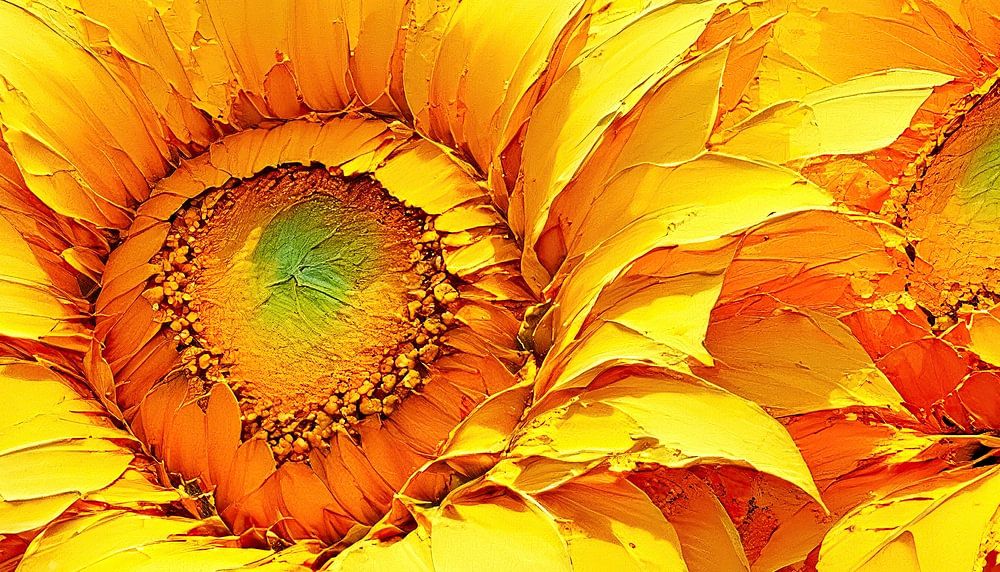 The composition deliberately dispenses with depth or classical perspective - instead, the blossom itself fills the entire space, dominating the surface and drawing the viewer's attention into an immediate, almost physical proximity to nature. Each blossom appears to be a small universe of its own, in which life and transience rest in equal measure. The heavy brushstrokes lend the sunflowers not only texture but also weight - they appear tangible, almost sculptural.
