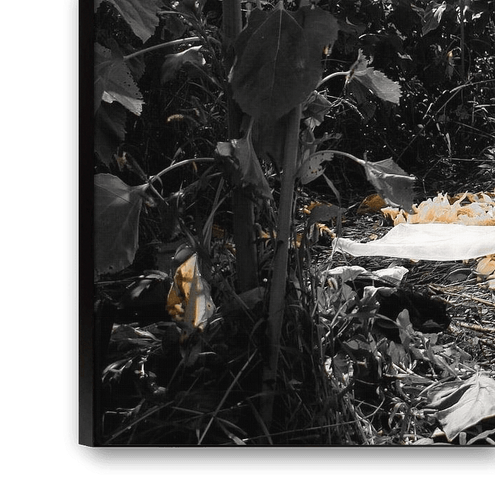 What makes the picture extra special is the use of colour: most shades are muted or black and white, while the sunflowers and leaves retain subtly coloured highlights. This gives the image a melancholic, almost timeless feel and enhances the contrasts between the soft fabric, the rough earth and the powerful flowers.
