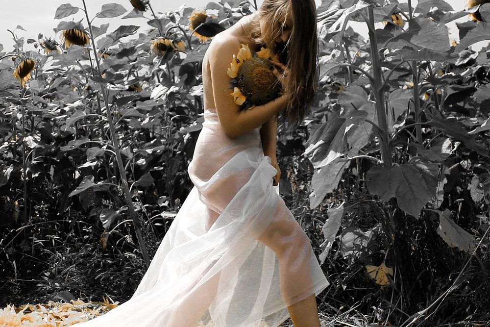 This picture shows a dreamy and artistic composition of a woman in a field of sunflowers. She is wearing a translucent, flowing dress that emphasises her movement and creates an almost ethereal effect. Her pose is elegant and introspective; she seems to be embracing herself or holding a bunch of sunflowers against her, evoking a sense of connection with nature.