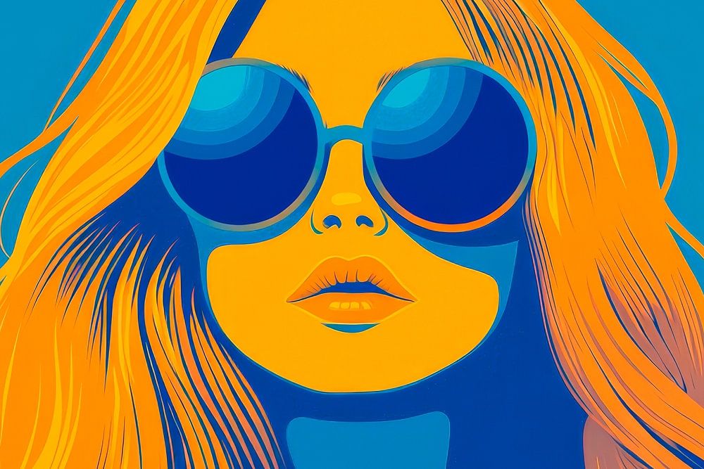 Bright colours and a cheerful expression give this illustration of a stylish woman with sunglasses a relaxed holiday mood. The vibrant blue and orange tones evoke a sense of summer and adventure. Perfect for the living room to create a positive atmosphere and liven up conversations.