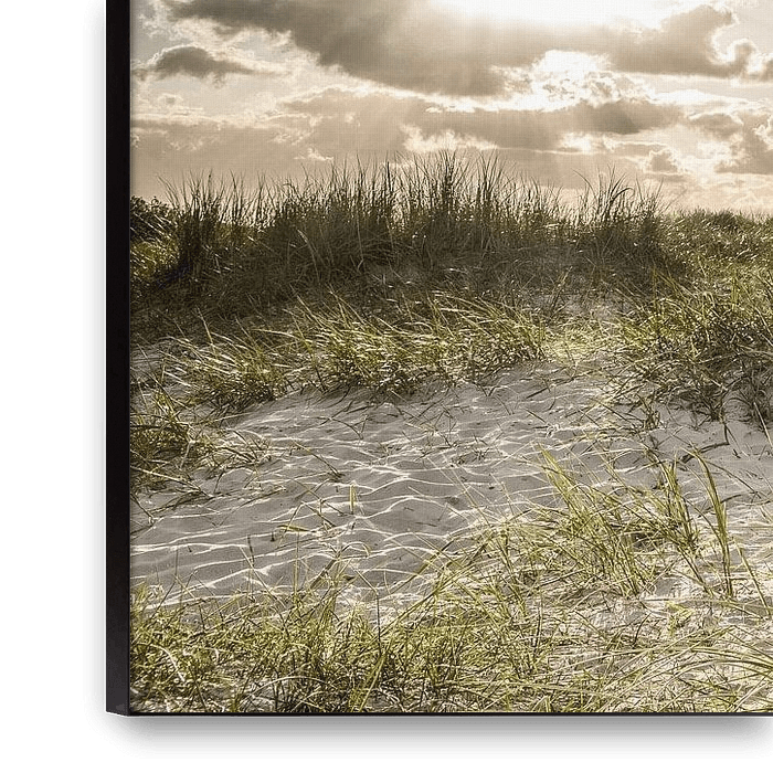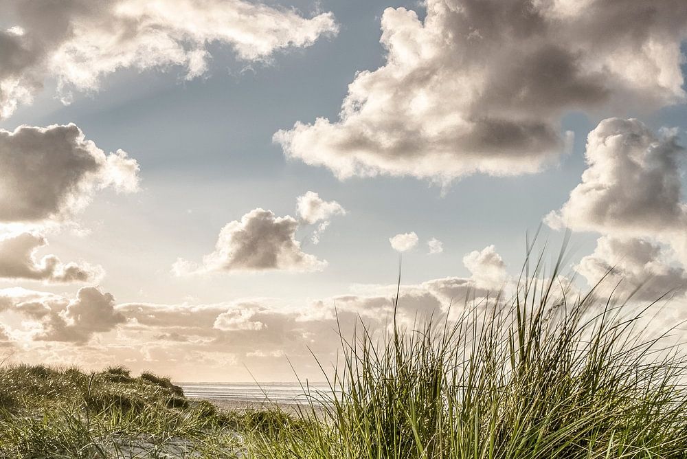 The landscape photograph "Sunlight I" shows a sand dune covered in dune grass on the North Sea coast, backlit by the setting sun. Taken on the beach at Schillig on a summer evening in 2015, with a blue sky and clouds.