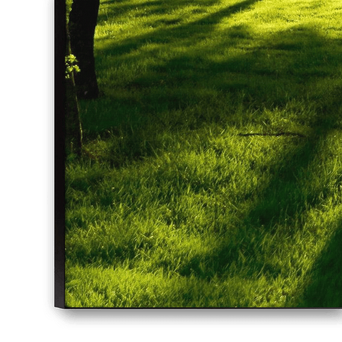 A photo taken against the sun. Part of a flare of the sun can just be seen next to the tree in the middle. This is in the park near my house in France. I always wait to walk until the sun is low to avoid harsh contrasts in my photos's. The trees are in a field with a thick layer of grass. Photo was taken in May, so a nice spring image.