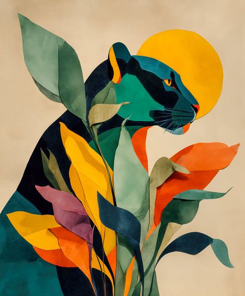 A modern abstract illustration of a sleek black panther partially hidden among vibrant tropical leaves, with a glowing sun behind it. The layered shapes and bold colors give the artwork a paper-cut collage style, blending nature, mystery, and elegance into a striking visual composition.