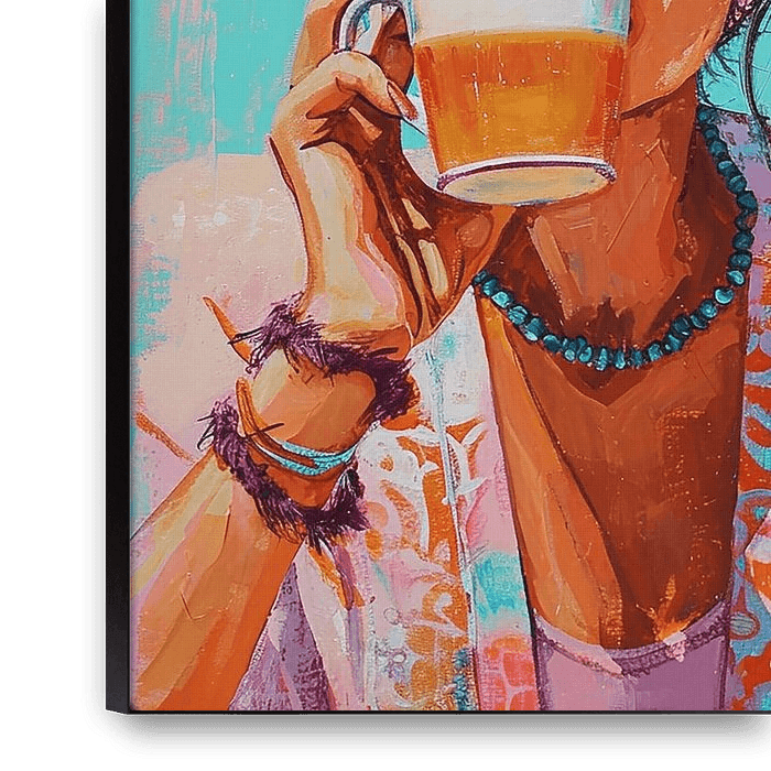 An illustration of a woman drinking tea in the sun, in the style of Mexican folklore-inspired, acrylic art. Cheerful, with pink and aquamarine hues, polychrome terracotta, with bold contrasts and playful textural play, creates a vibrant image. The whole exudes a playful, yet sophisticated atmosphere.