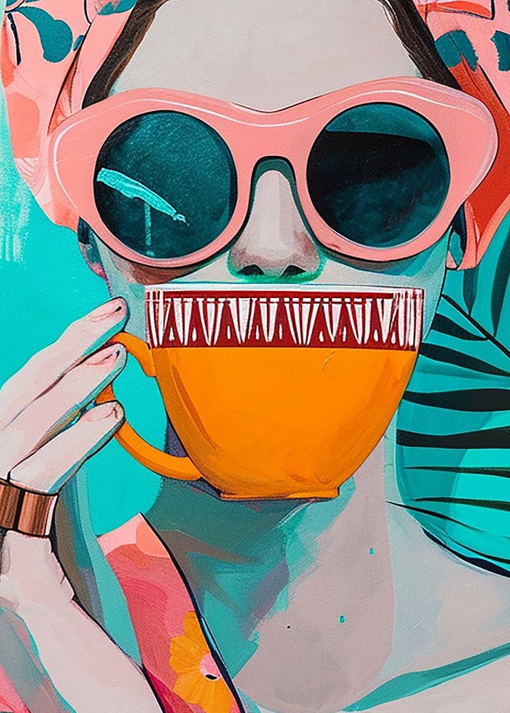 An illustration of a woman drinking tea in the sun, in the style of Mexican folklore-inspired, acrylic art. Cheerful, with pink and aquamarine hues, polychrome terracotta, with bold contrasts and playful textural play, creates a vibrant image. The whole exudes a playful, yet sophisticated atmosphere.