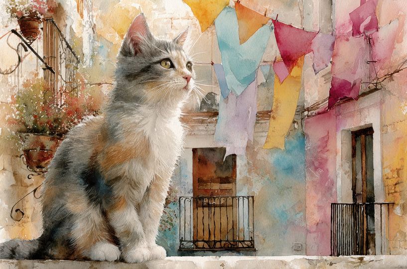 In this alleyway in the South, time seems to stand still for a moment. The cat, languid and content, sits in her familiar spot while the sunlight glides along the facades and the laundry above her gently moves in the warm breeze. The colours of the houses — pastel, weathered, full of character — tell stories of days that came and went, of people who lived, laughed and opened their windows to the world.