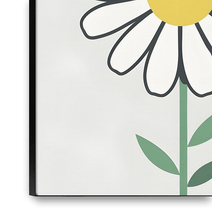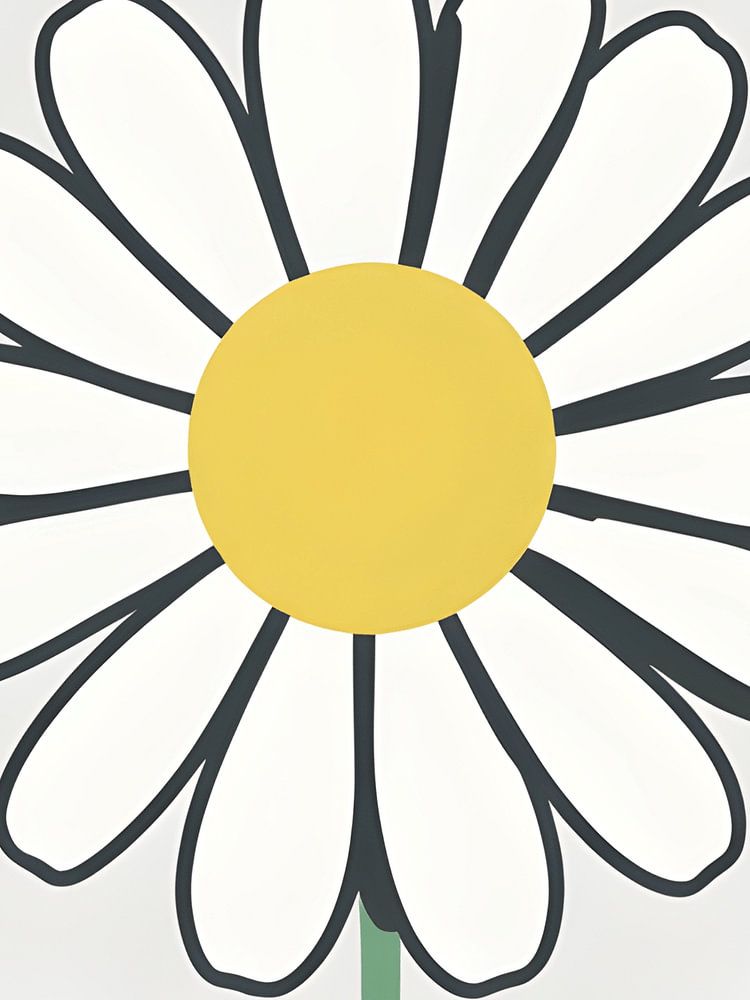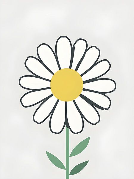 A cheerful and playful illustration of a simple daisy with white petals outlined in charcoal gray and a bright golden yellow center. The minimalist design captures the innocent joy and sunny disposition of this beloved flower, complemented by a slender green stem and delicate leaves. This artwork radiates happiness and simplicity,…
