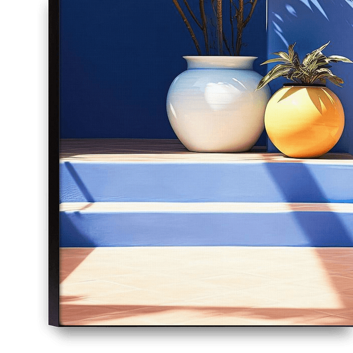 The deep blue wall is a powerful contrast to the full white ceramic pot and the soft orange tones of a ripening citrus fruit. The strongly defined shadows cast geometric patterns on the bright blue steps, giving a calming rhythm…