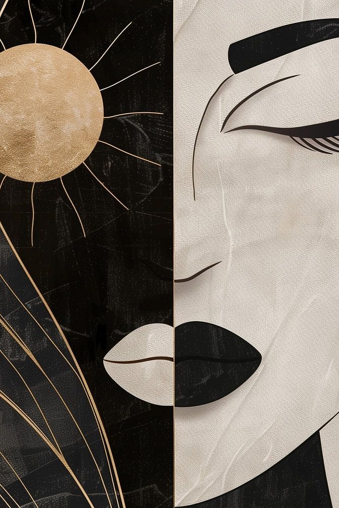Black-and-white portrait of a beautiful woman with her eyes closed. One eye is symbolised by the sun. Beautiful balance in black and white and yin and yang. Thin sophisticated lines, simplistic and outspoken at the same time. Matching various styles and trends, such as summer, sober, black and white, natural. Artist: Bianca ter Riet.