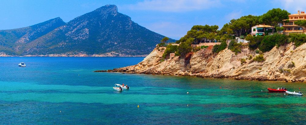 Sunny day on the rocky beach with blue water. Palma de Majorca, Spain