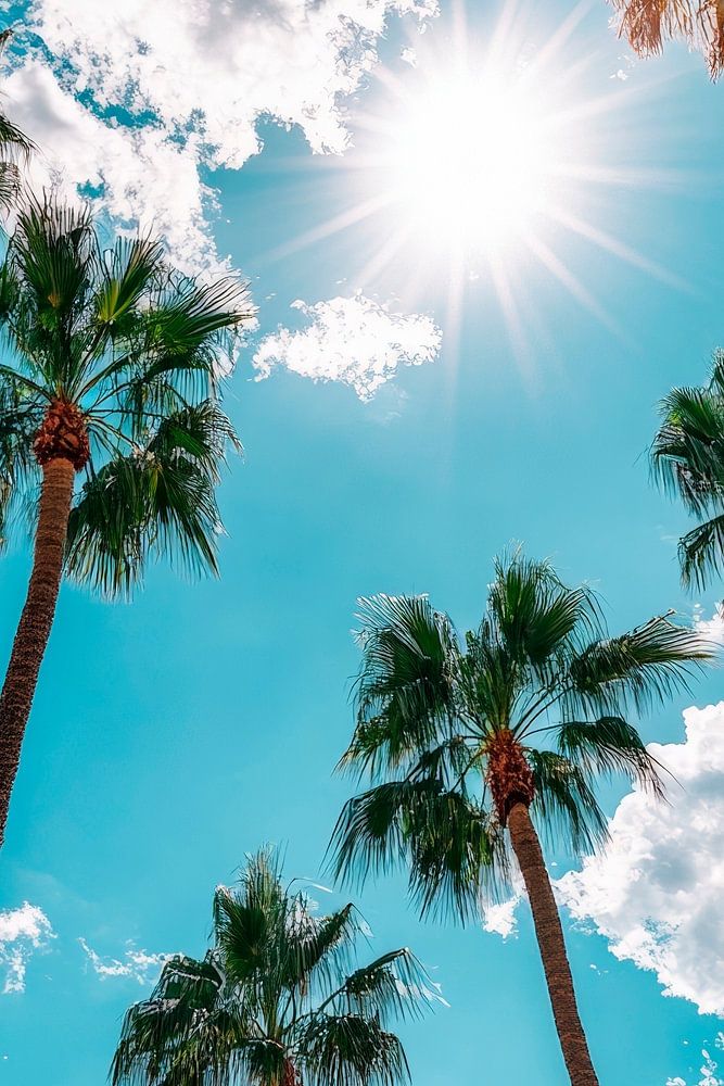 Bright sunshine and majestic palm trees give this picture a feeling of holiday joy and relaxation. The bright orange umbrellas set cheerful accents and invite you to linger. Ideal for the living room, it brings a bit of summer into the home and lets everyday life fade into the background. Perfect for an oasis of well-being!