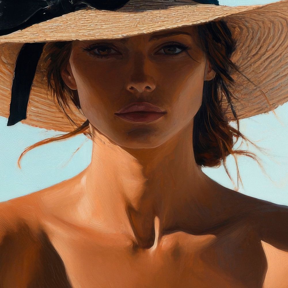 In a radiant sea of light, a mysterious beauty in a large, elegant straw hat epitomises the feeling of summer and freedom. Her intense gaze, framed by the gentle waves of the breeze, hints at the warmth of the day. The casual blouse that gently drapes over her shoulders perfectly frames the harmonious combination of elegance and light-heartedness.